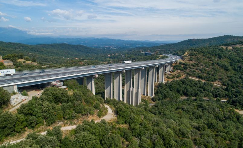 Sur la section Le Boulou - frontière espagnole de l'autoroute A9, Freyssinet France, en collaboration avec GTM Sud-Ouest TP GC - VINCI Construction France, travaille au renforcement de 3 viaducs à l'aide de précontrainte additionnelle et de TFC® (tissu de fibres de carbone).