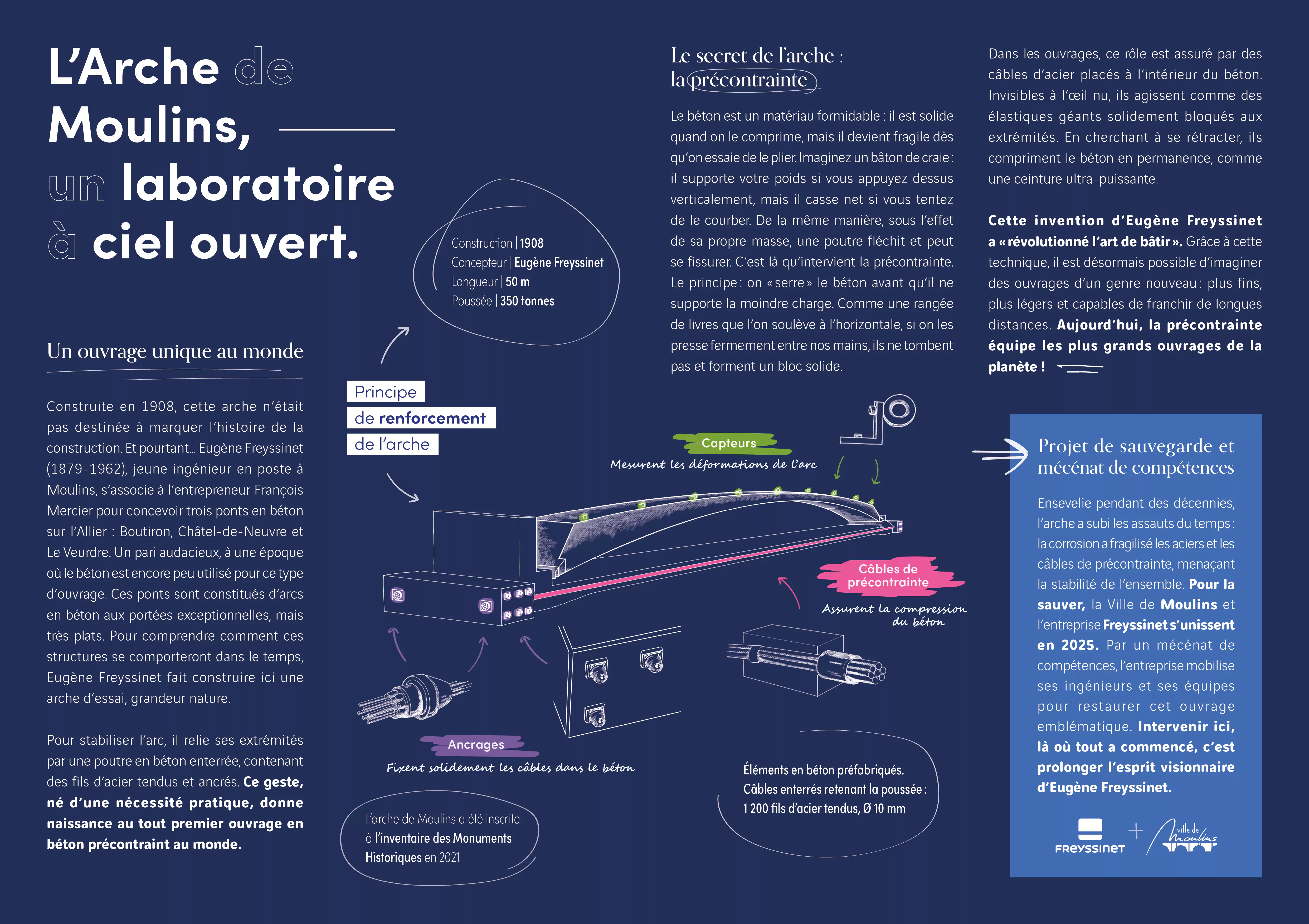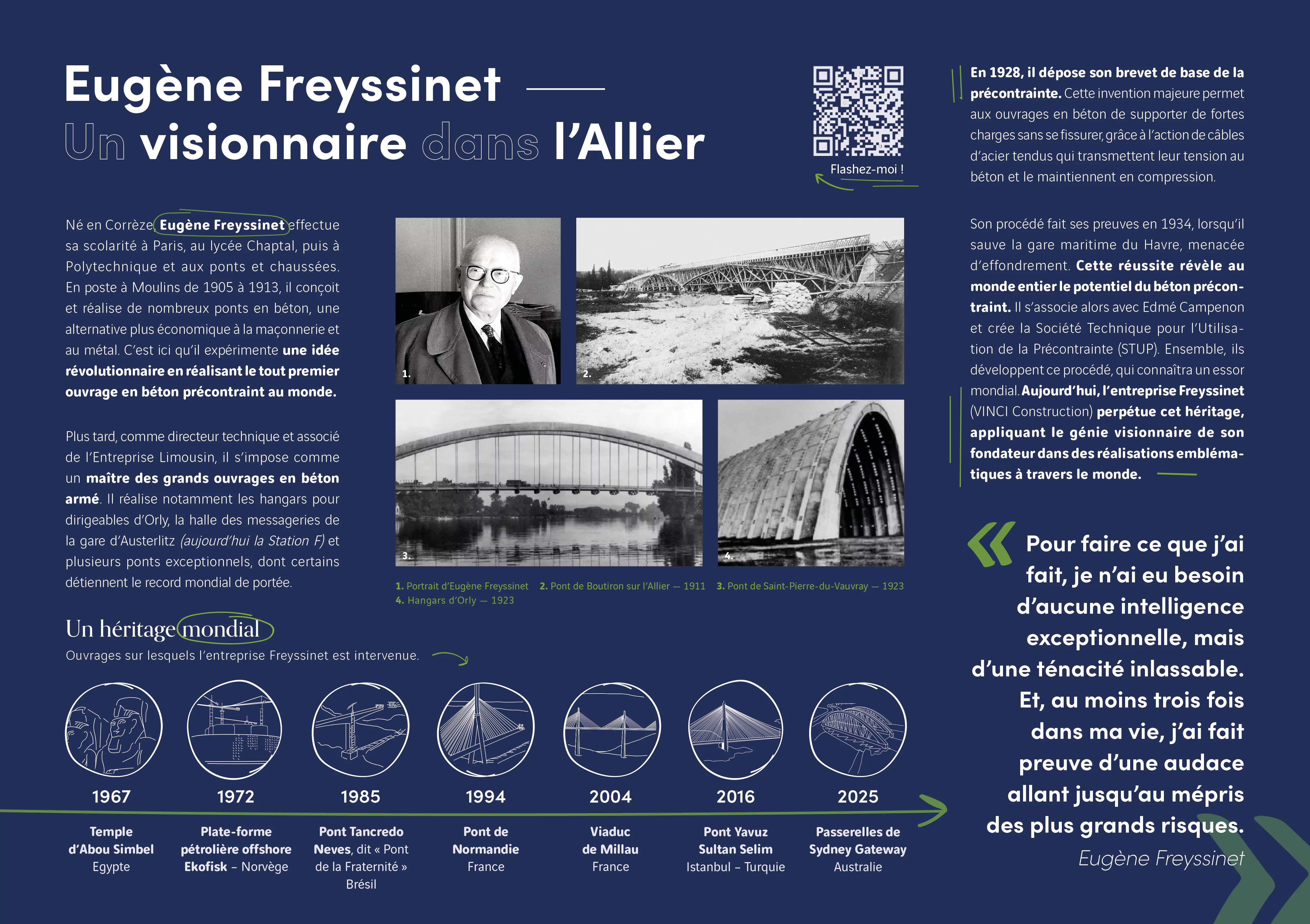 Tout commence lorsque Eugène Freyssinet, alors jeune ingénieur des Ponts et Chaussées, arrive dans l’Allier avec une mission, bâtir trois ponts en béton : au Veurdre, à Boutiron et à Châtel‑de‑Neuvre.
